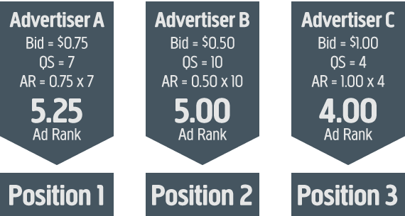 Tiga hal di atas akan berjalin kelindan menentukan biaya per klik, jumlah kali tayang, serta posisi iklan (paling atas adalah posisi paling baik). Sebagai contoh: jika Google menganggap kata kunci tidak relevan dengan produk yang ditawarkan, maka Anda akan mendapat Quality Score yang jelek, dan akhirnya biaya perklik menjadi lebih mahal dari idealnya.